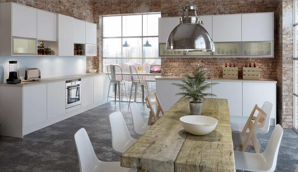 Puro blanco, donde la luz se convierte en la máxima prioridad. Si tanto blanco resulta excesivo, puedes equilibrarlo con el mobiliario o con una encimera en madera natural clara como el fresno o el arce. Si te decides por esta opción, intenta que el tono de la madera sea uniforme, con poca veta, y procura usar la misma variedad para conseguir un ambiente armónico.