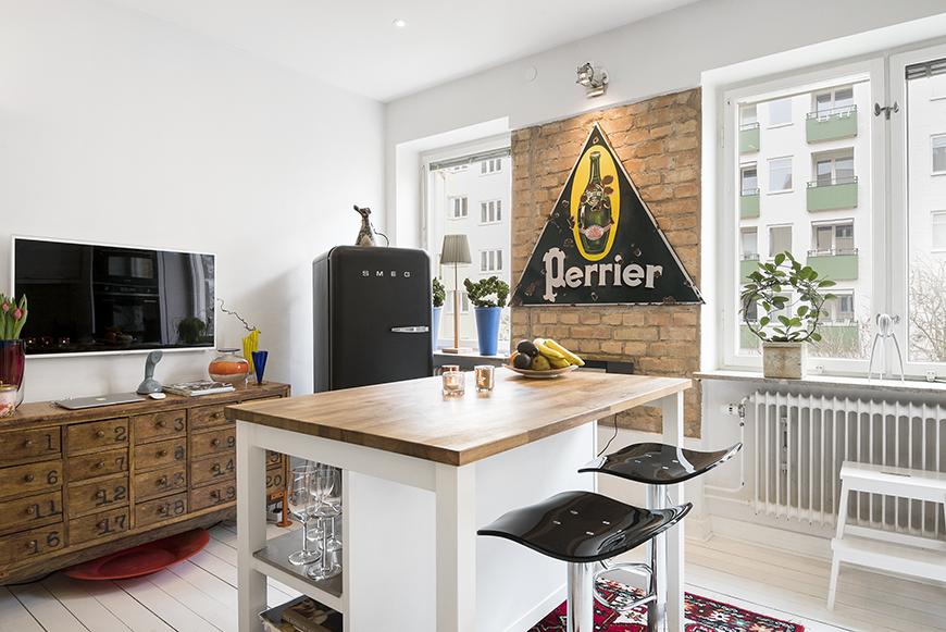La mini cocina, el salón estar y la zona de trabajo y lectura, comparten espacio sin tabiquerías que los separen, creando un ambiente unitario para compartir y disfrutar. En la cocina, el pequeño detalle de la pared de ladrillo visto, aporta calidez y personalidad, al igual de cada una de las piezas eclécticas en color, elegidas para cada espacio. En definitiva, se trata de un apartamento original, que aprovecha la entrada de luz a través de sus ventanales, de forma increíble, haciendo resaltar los espacios y sus piezas. Un mix ecléctico ideal entre vintage y rústico, con acentos en industrial y nórdico. Es de ese tipo de interiores en los que confluye todo y combina de forma equilibrada, creándose una atmósfera muy agradable y cálida, con un solado en madera natural que refuerza todo el interiorismo.