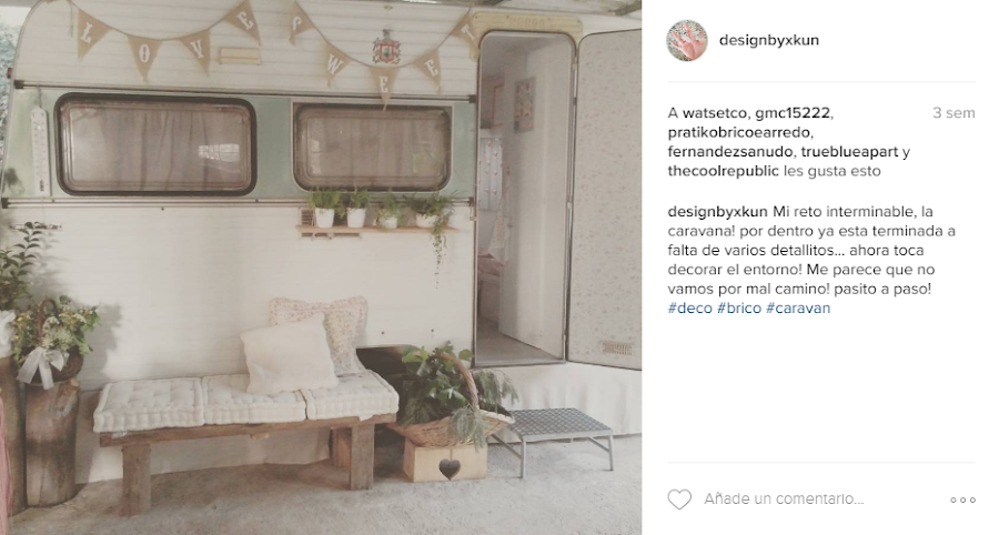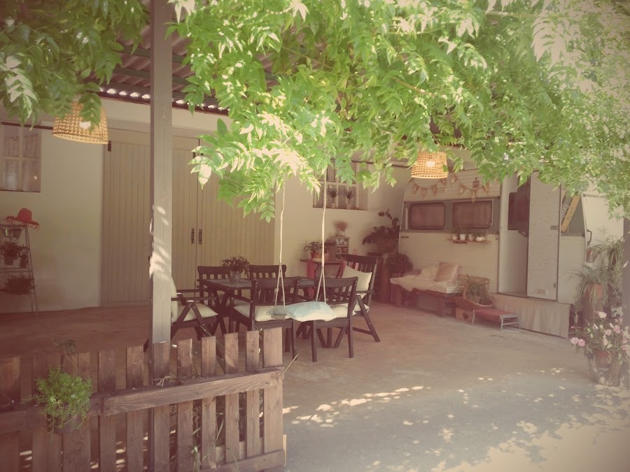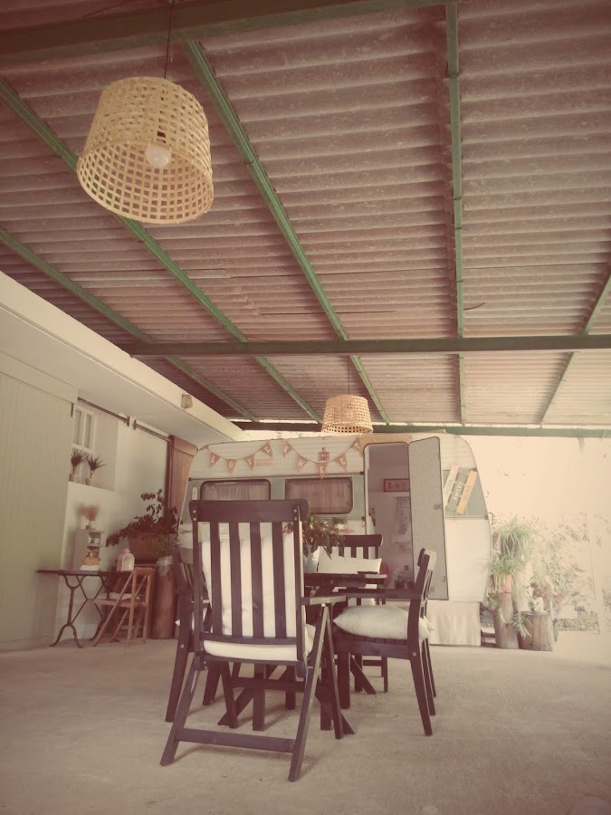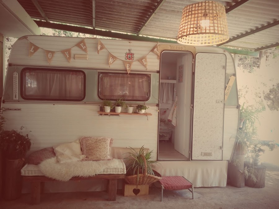 Primero empecé con la caravana, es mi rinconcito donde tengo mis telas y mis cositas para hacer manualidades, aunque por dentro nos quedó preciosa (podéis verlo aqui), por fuera no dejaba de ser un "pegote" así que decidí darle un lavado de cara, y coloqué algunos elementos DIY que combinados en armonía crean un ambiente bastante acogedor.