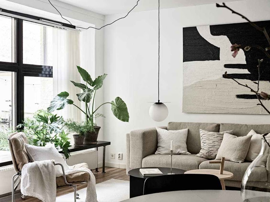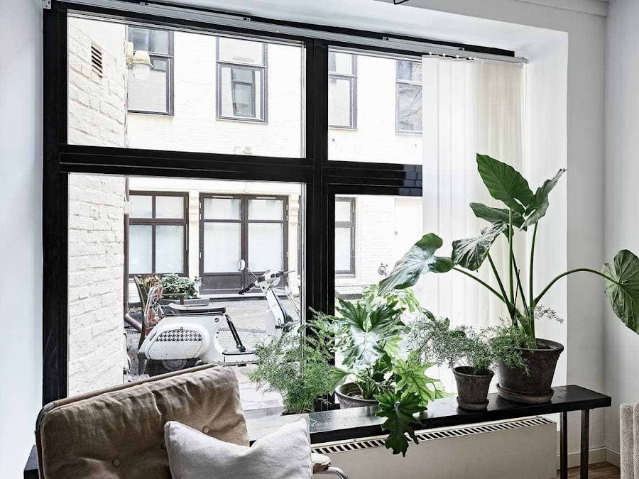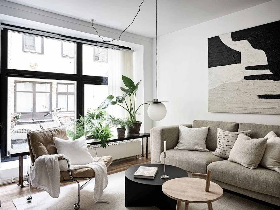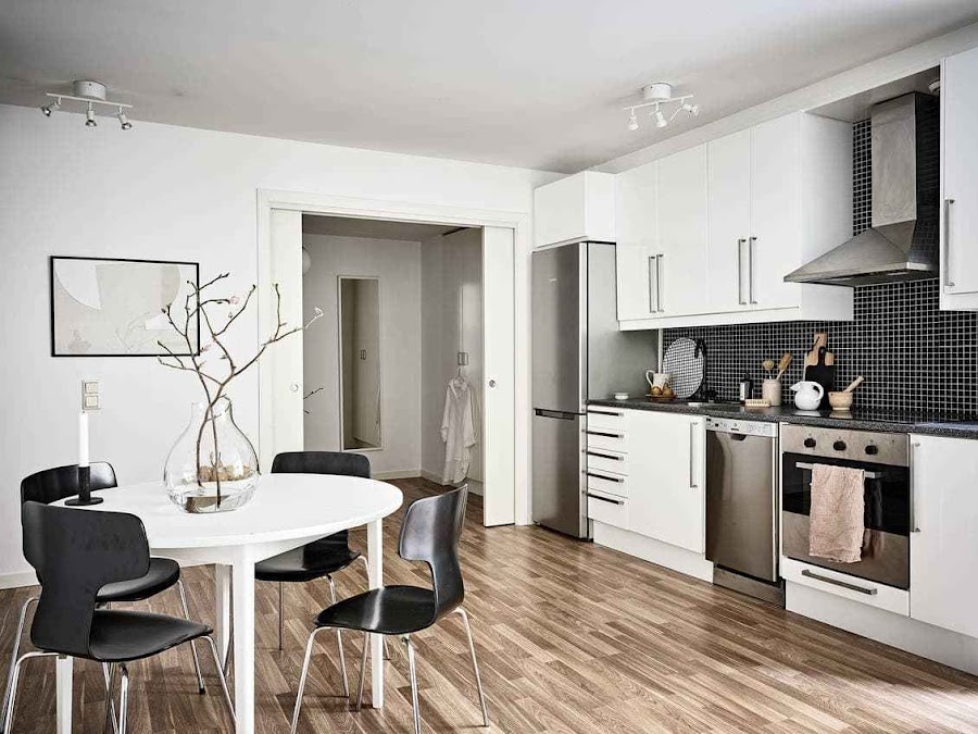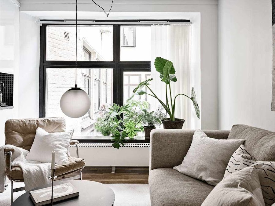 Para poder vivir a gusto en un piso como este, hay que saber priorizar y elegir muy bien los muebles. En este estudio nórdico podéis ver que hay un sofá pequeñito, un sillón y un par de muebles accesorios, nada más, ni cómodas, ni estanterías, librerías etc. El comedor y el dormitorio son también muy básicos, lo que permite tener libertad de movimientos.