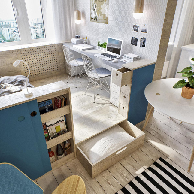 Un acierto es haber aprovechado para hacer una pequeña estantería cerrada en el tabique que separa la zona de descanso de la del salón. Además, al haber levantado la "habitación" han conseguido un extra de almacenaje, que en tan poquito espacio viene genial!