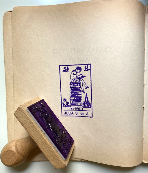 Así como hemos comentado que en el trabajo es difícil encontrar quien use estos tampones en su versión más tradicional, sí hay un campo en el que mantienen todo su encanto original; las manualidades y, sobre todo, los exlibris. Y resulta que somos unas enamoradas de éstos últimos. Ese gesto de estampar tu impronta más personal en las páginas iniciales de un libro nos parece muy romántico, como de otra época...y hemos intentado transmitirles ese mismo sentimiento a nuestros hijos, así que ellos también tienen el suyo propio.