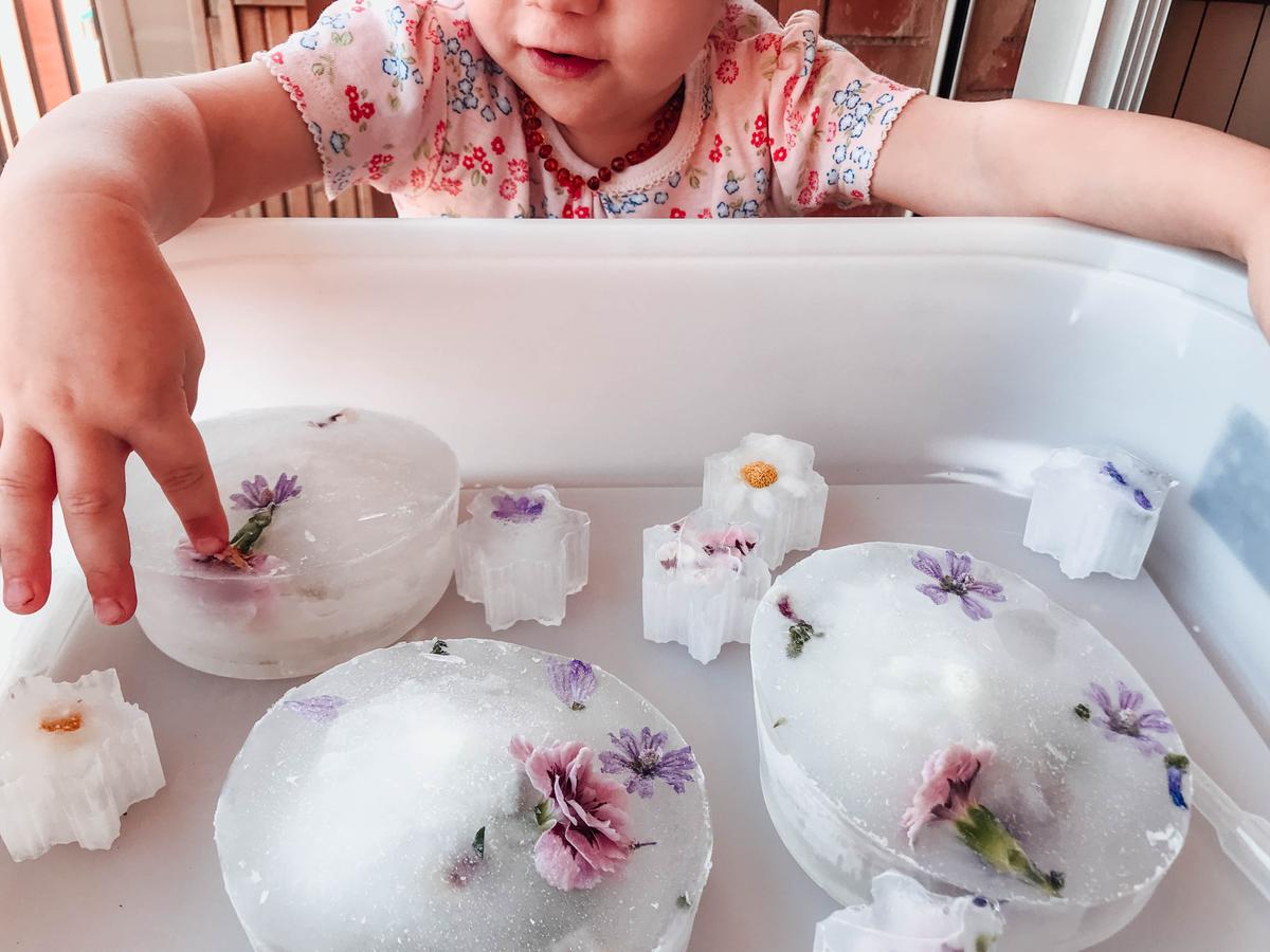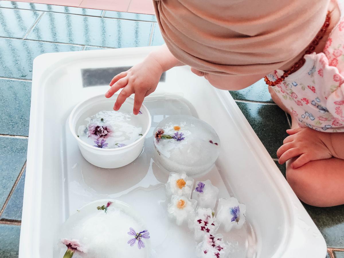 Cualquier actividad que ofrezcamos a los peques con agua les encantará, es un material que les fascina y les atrae así que su atención la tenemos asegurada. En este caso le presenté el agua en el formato de hielo. Mi intención es irle ofreciendo el hielo con más materiales con el fin de que ella llegué a descubrir las posibilidades que posee y cómo poder descongelarla.