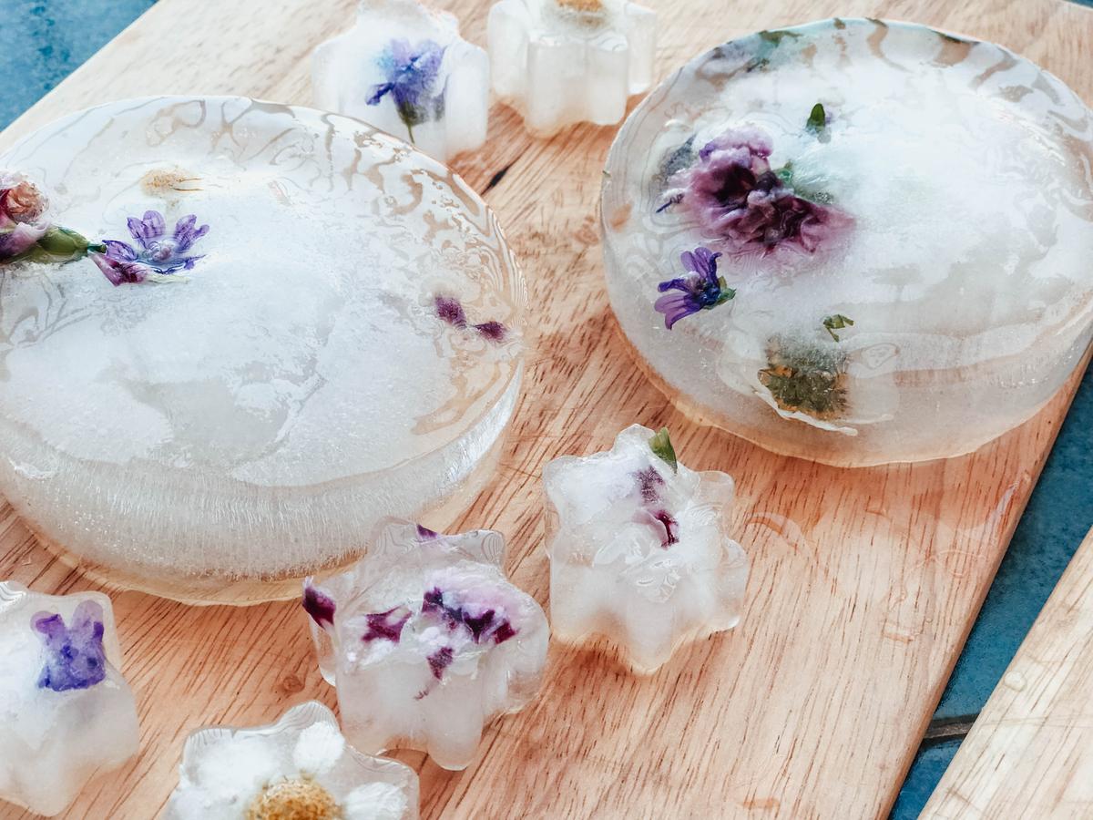 Como os he dicho tenéis que preparar el hielo unos días antes. ¿Por qué? Básicamente porque veréis que al llenar el táper y poner las flores se quedan en la superficie o en la base, y a nosotros lo que nos interesa es que se queden en medio, por lo tanto tendremos que poner un poquito de agua y flores y congelar. Al cabo de unas horas cuando ya esté congelado, volvemos a poner agua, flores y al congelador. De este modo iremos consiguiendo capas y flores en medio.