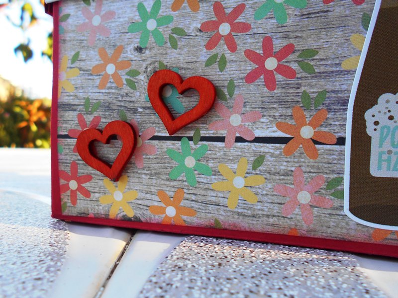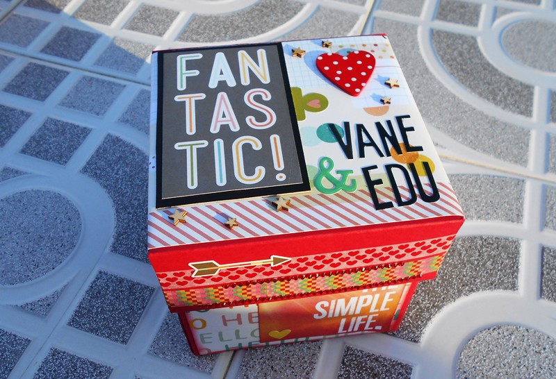 Era una caja con mucho color, detallitos, con una foto del grupo de amigos, y especialemente llena de sobres donde esconder dinero. La idea es muy buena, ya que los novios no sabem cuánto dinero hay en el interior, así que han de ir buscando por todos los rincones.