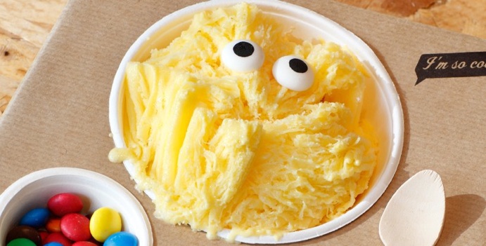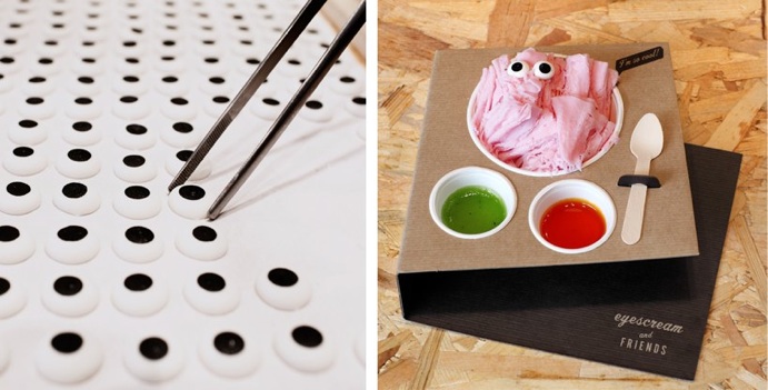 Eyescream se convierte en una experiencia. Para empezar m+m decidió separar los toppings del helado, (en Taiwán se sirve todo junto) y añadir unos ojos de azúcar enormes creando así un carismático monstruito, un personaje entrañable, que te mira a los ojos y se convierte en tu compañero helado.