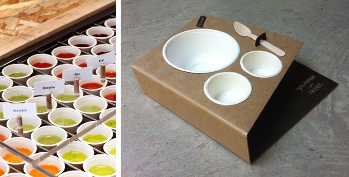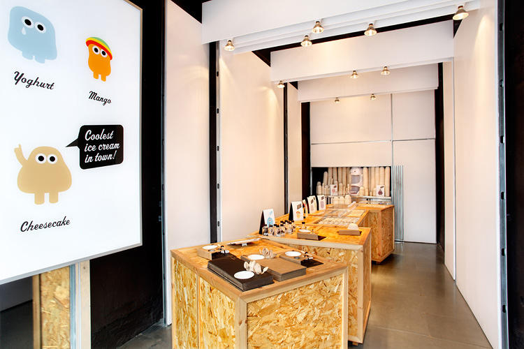 Acto seguido surgió el nombre, Eyescream que se pronuncia como ice-cream, y el recorrido del local tenía que desarrollarse como un selfservice donde el consumidor pudiera customizar su propio personaje con un packaging sencillo y económico donde encajar los cuencos de helado y dos toppings.
