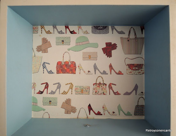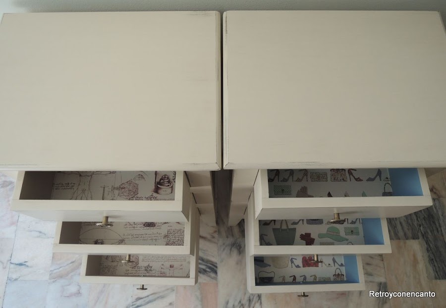 Para el interior de los cajones, esta vez tuvimos el detalle de ponerle a Javier un papel más masculino en su mesilla...
