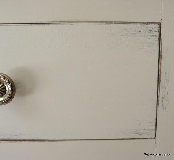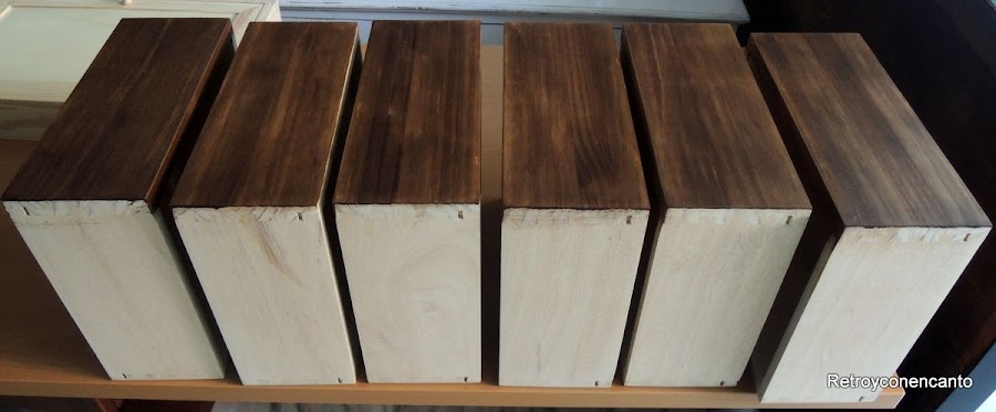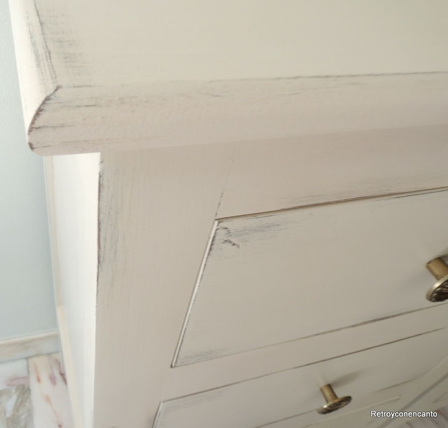 Al hacer juego con la cómoda, e ir igualmente decapadas, tuvimos que teñirlas previamente en nogal. En los cajones podéis apreciar la diferencia de color.