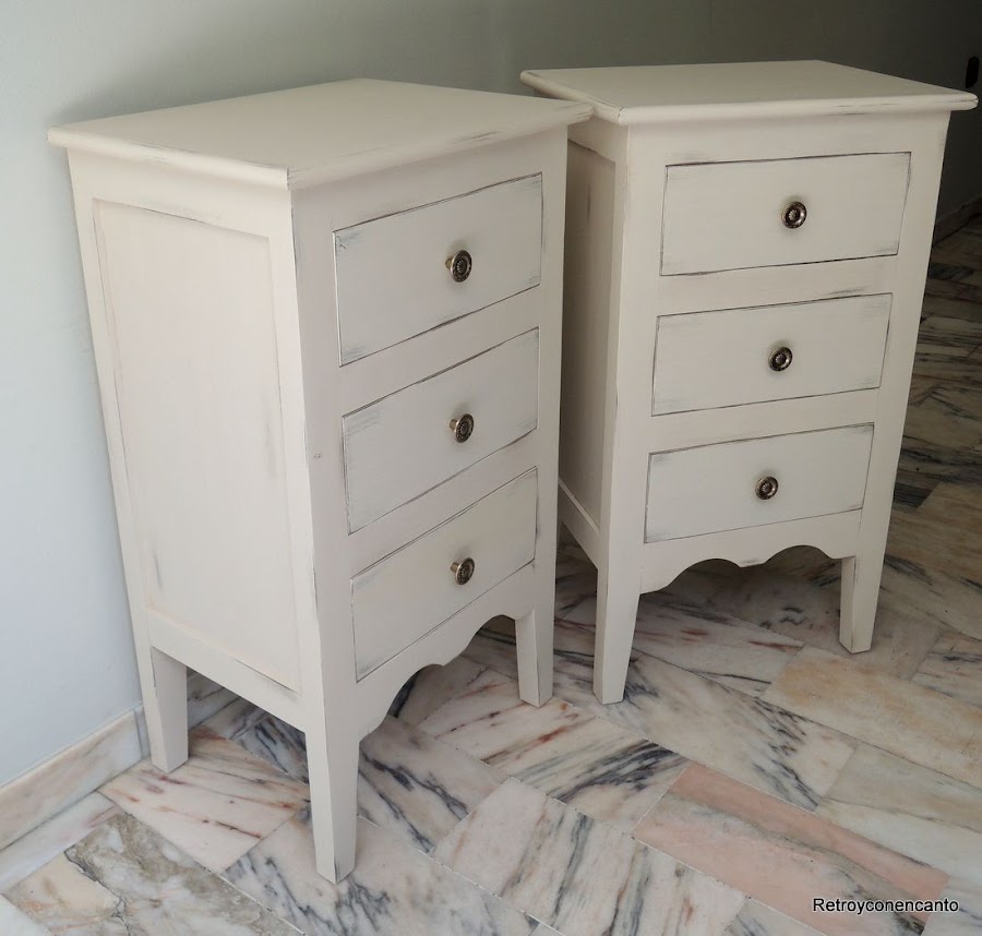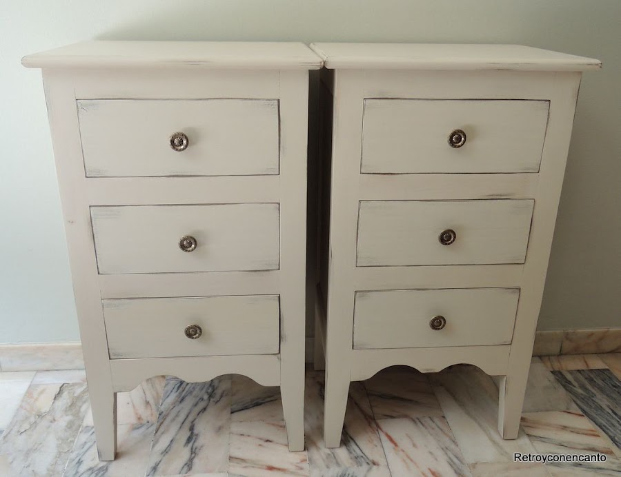 ¡Por fin hemos terminado el trabajo de Mª José y Javier! ¿Os acordáis de la cómoda que hace unas semanas os mostrábamos aquí? Pues teníamos pendientes las dos mesitas de noche. Esta vez, son ellos los que se encargaron de comprarlas en un comercio de su localidad, especializado en muebles para decorar. En bruto y de madera de pino, este es el aspecto que traían (disculpad la foto, pero la hemos cogido de la web de la tienda... ¡Obvia decir que se nos pasó hacerlas!)