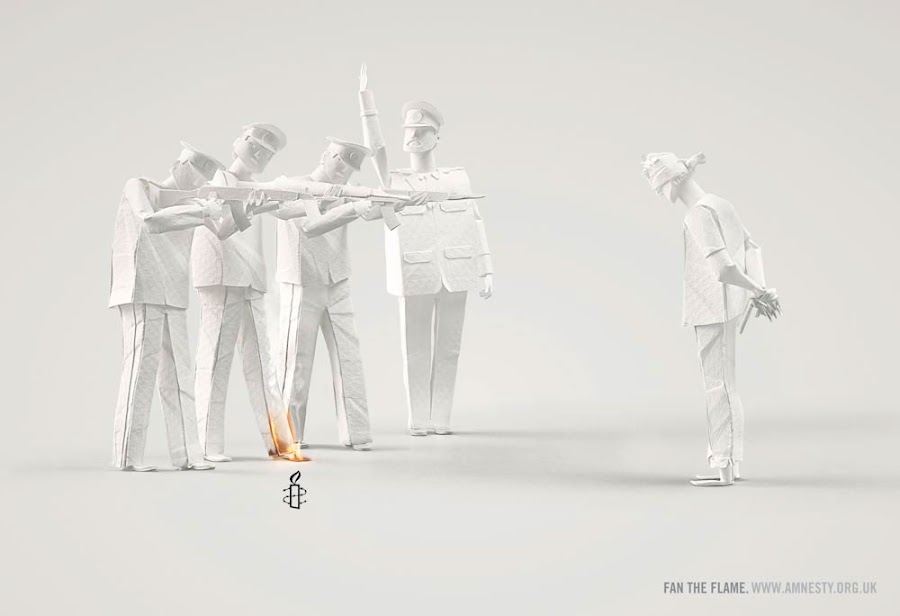 "Fan the flame" (aviva la llama) quería representar escenas de injusticias cometidas alrededor del mundo pero no se quería señalar a nadie concretamente, de ahí a que se buscara un medio en el que los personajes fueras anónimos, sin cara ni nación. De ahí a que recurrieran a People Too para que representaran las escenas en papel blanco y luego a través del retoque fotográfico representar la llama que prende al que produce la injusticia invitando a todo el mundo a avivar la llama y se acaben de una vez.