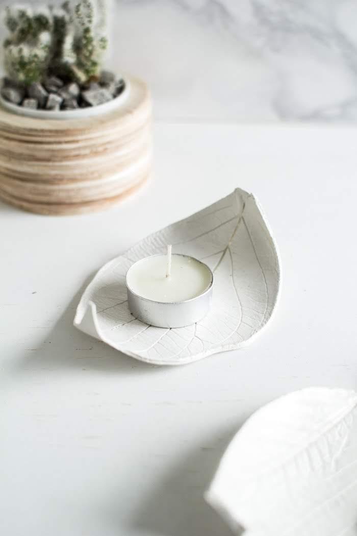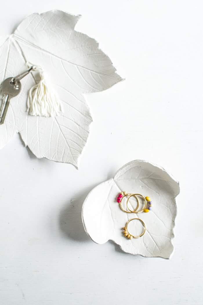 Primero de todo hay que extender la arcilla con un rodillo. Colocamos la hoja encima de tal forma que se quede marcada toda la textura. Luego recortamos la arcilla y antes de que se endurezca el molde lo colocamos dentro de algún cuenco o recipiente que tengamos en casa. Así obtendremos la forma deseada. Lo dejamos secar. Podemos pintarlo o simplemente dejarlo del color de la arcilla. Si quieres ver como hacer este joyero más detalladamente paso a paso, visita el post: [DIY] Hojas decorativas.