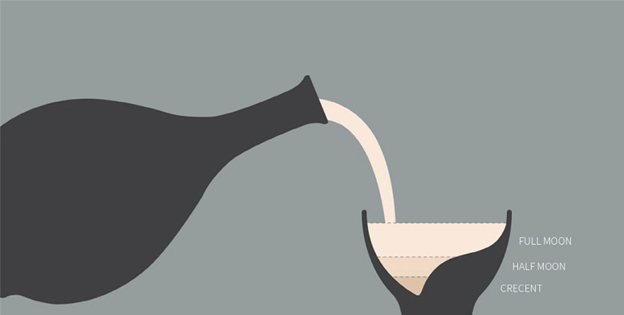 Su forma del interior hace que según se vaya dando sorbos, en el fondo aparecen diferentes fases del ciclo lunar. Las hay en negro para las bebidas blancas (leche...), y en blanco para las bebidas oscuras como el té.