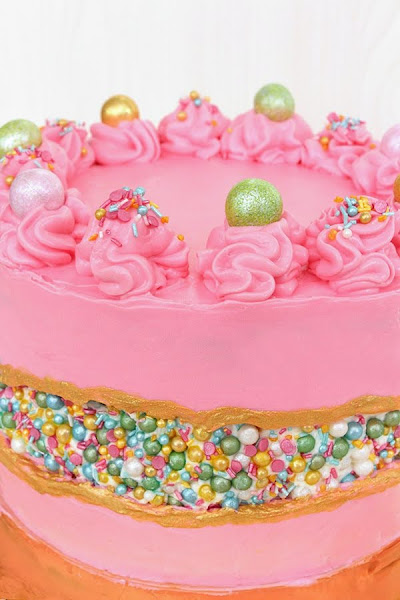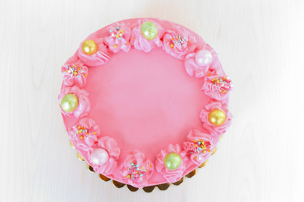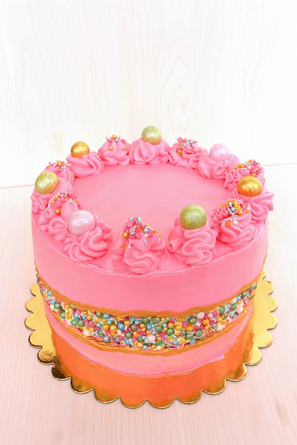 La parte superior la he decorado con frosting de crema de queso, sprinkles y bolas de chocolate de colores.