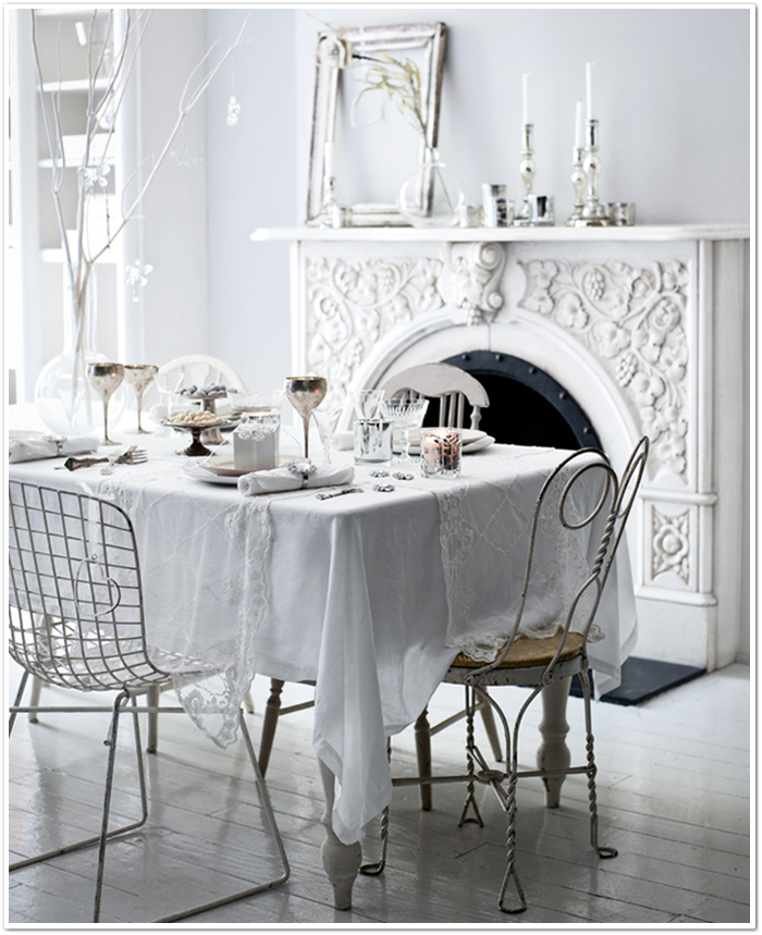 Hoy os traigo inspiración de domingo, decoración en blanco y plata, un poco de brillo y piezas vintage. Sillas mixtas alrededor de la mesa y unos textiles con mucho encanto. Wow, blanco sobre blanco, fácil, sencillo y encantador.
