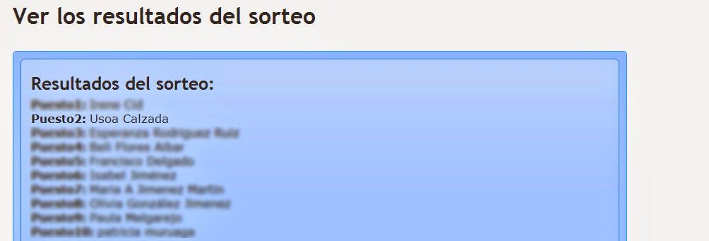 Como ya sabéis, hemos hecho el sorteo desde la plataforma Sortea2, y en este caso, la ganadora no había seguído todos los pasos imprescindibles para participar en el sorteo, asi que la primera suplente, Usoa Calzada se ha llevado el premio. ¡Muchas felidades!