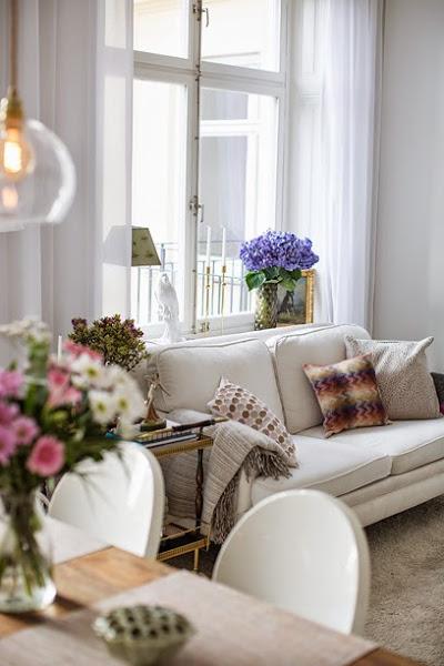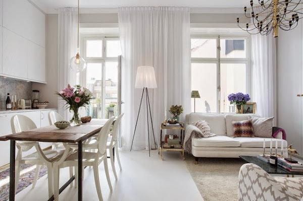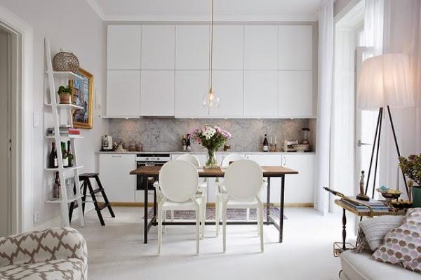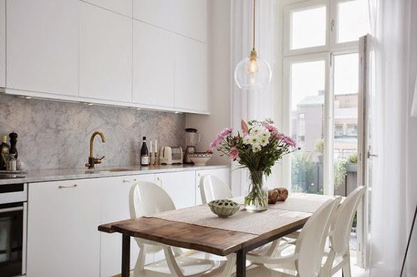 Con una cocina abierta a la zona de comedor y salón, todo el mobiliario se encuentra integrado en blanco a modo de piezas completas casi de suelo a techo, donde el frontal de mármol blanco de la zona de trabajo es lo único que rompe con el esquema. La mesa de comedor en madera natural y hierro aportan el toque de calidez junto a las flores y las macetas con plantas. Una mención especial es para las lámparas llenas de personalidad y diseño.
