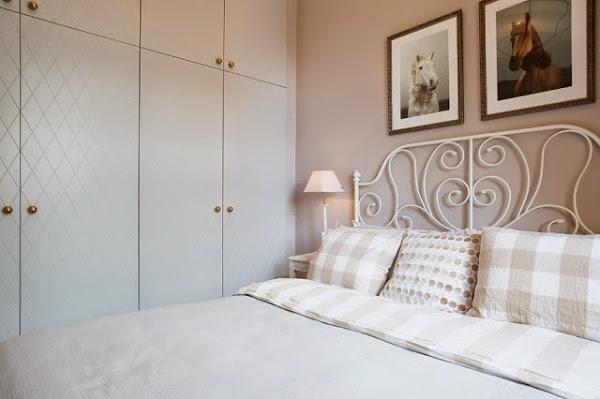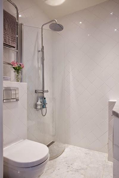 Teniendo en cuenta que los metros no son muchos, todo encaja en su sitio. El el baño destaca por su revestimiento de pared con azulejos blancos cuadrados colocados a cartabón y, como en casi todas las viviendas nórdicas, por falta de espacio en la cocina, la lavadora-secadora se integra perfectamente en esta estancia. Un mini apartamento muy “cuco” pero nada “cursi” lleno de todo lo necesario.