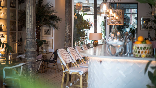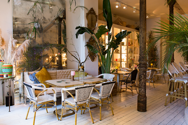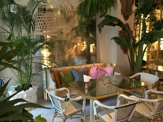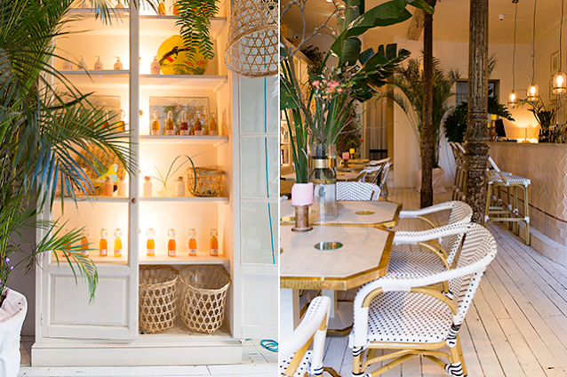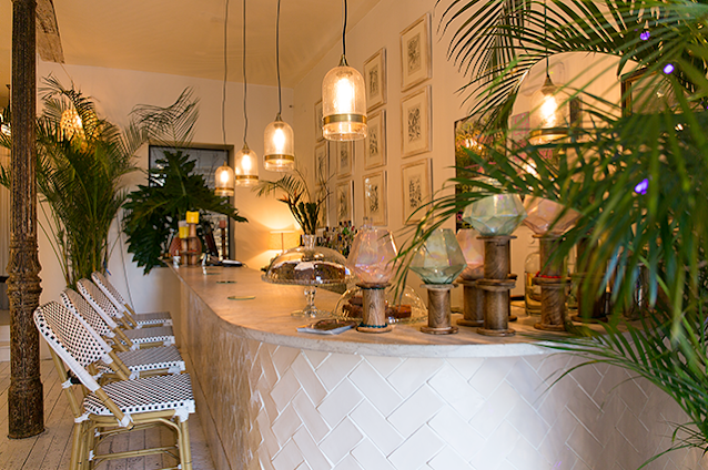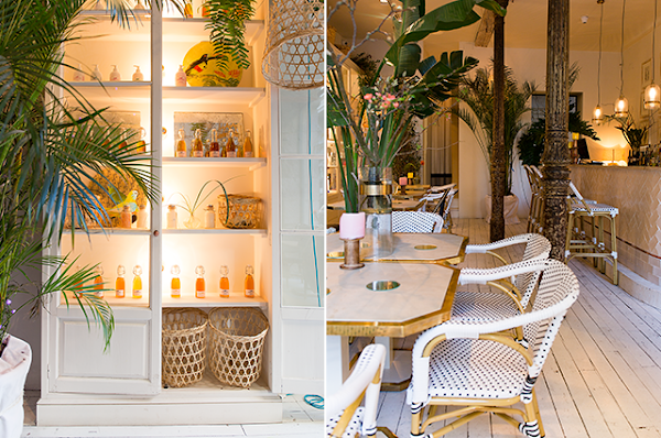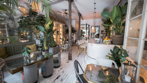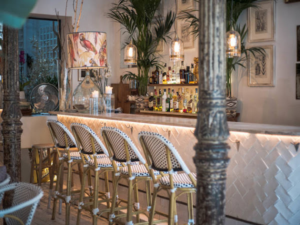 Ahora te encontrarás, un pequeño y espectacular local de copas que ha heredado la estética exótica y vegetal de su predecesor. Un precioso bar con unas mesitas y sillas de mimbre entre kentias y palmeras, columnas originales de hierro, un suelo de madera pintado en blanco y decapado que es ¡tan bonito por dentro! que te hace desear vivir allí.