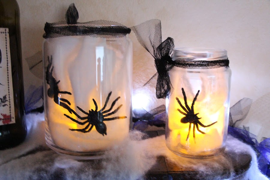 Dentro de un bote ponemos arañas de plástico, algodón y en el centro una vela eléctrica, hacemos una lazada con tul negro, y listo!