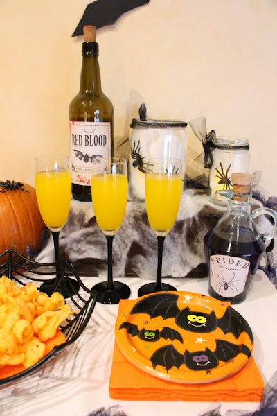 El menaje es importe que sea acorde con la decoración de la fiesta, platos de murciélago, servilletas naranjas y copas de cava con pie negro rellenas de naranjada.