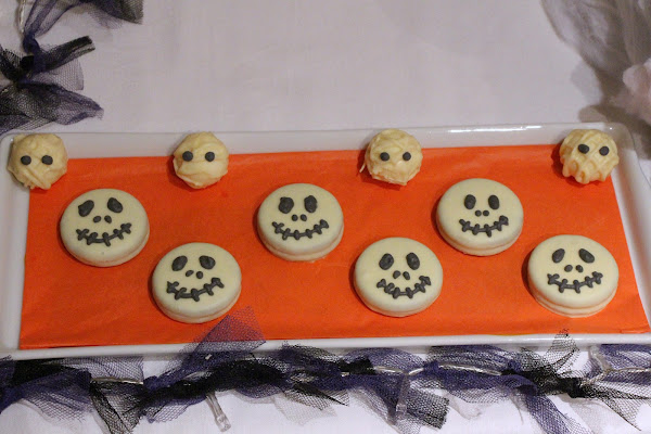 Decoré oreos y bombones Lindt de chocolate blanco convirtiéndolos en Jack Skellington y momias.