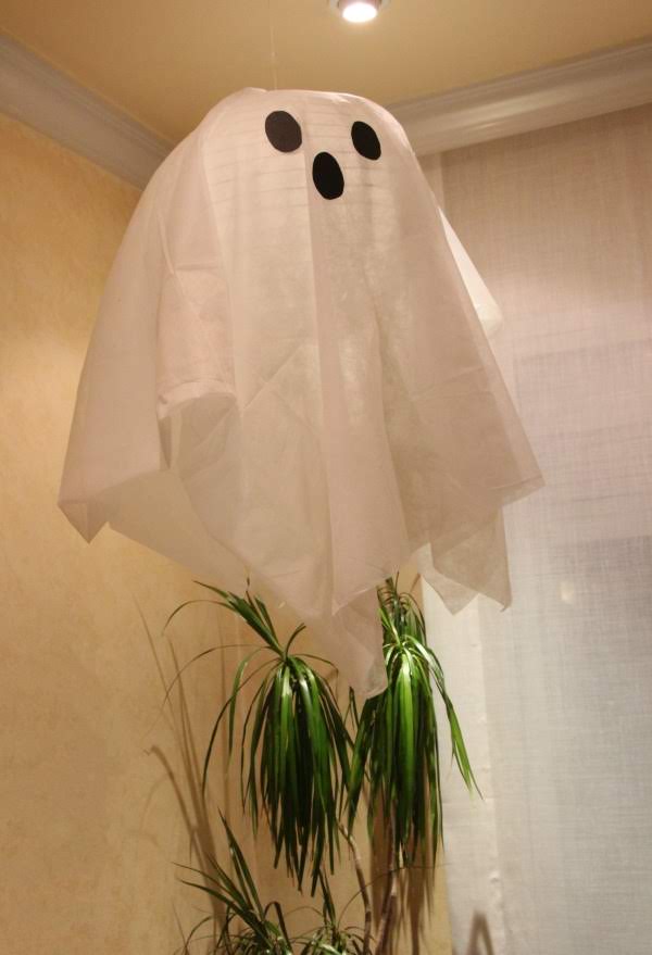 Como decoración hice varios fantasmas, unos con un globo cubierto con papel de seda blanco y otro a tamaño real con una sábana o una talla blanca, y ambos con cartulina negra para hacer los ojos.