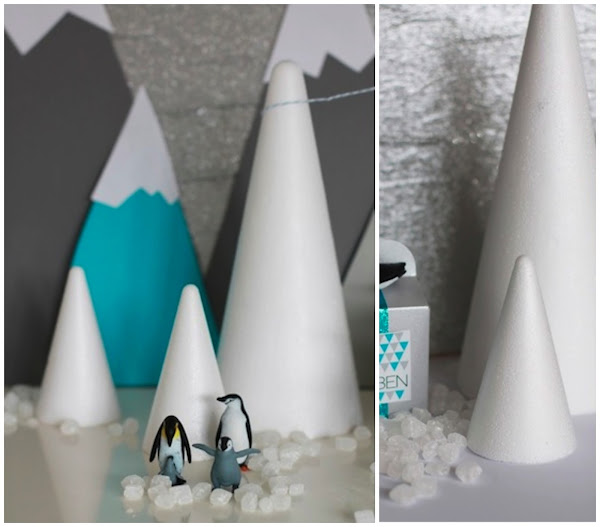 Unas montañas nevadas hechas con foam de colores y conos de stirofoam (los que se usan para manualidades) dan cierta perspectiva al backdrop de la mesa.