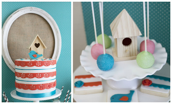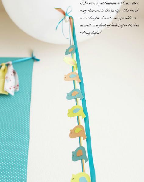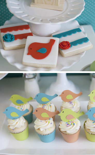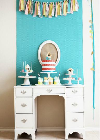 La fiesta de cumpleaños se centra en una decoración a base de pajaritos que puedes hacer en papel, tanto para los toppers como para la guirnalda que cae del globo gigante de helio, y unas cuantas casitas de pájaros de madera, que se compran en algunas tiendas online o en la sección de jardín en Carrefour.