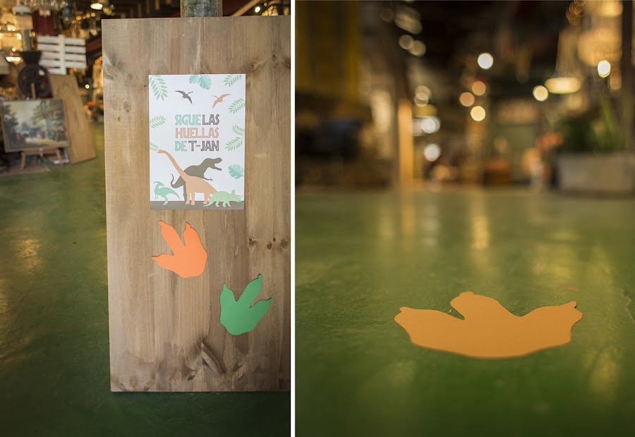 Varias cajas de madera, bolsas de tela y esos originales plato/dinosarios completaban el look de esta mesa tan original.