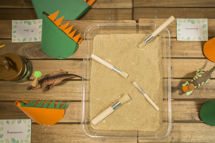 Los dinosaurios nos esperan con sus gorritos de fiesta y el kit para excavar fósiles está preparado para cuando lleguen los expertos en el tema!