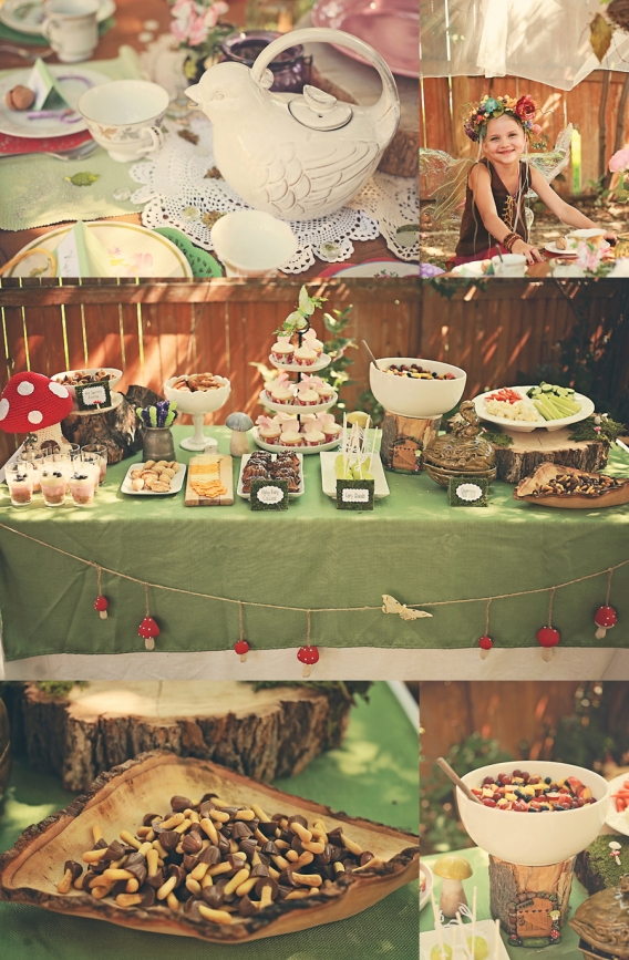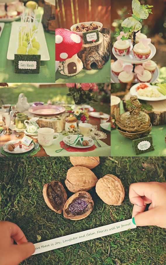 Estoy segura de que esta fiesta de hadas sorprendería a cualquier niño o niña... Collares con mensajes secretos dentro de las nueces, hojas, ramas, flores, troncos, porcelana fina de segunda mano, telas de tul, coronas de flores silvestres, y muchos detalles bonitos ¿No os parece?