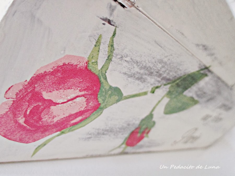 Sólo con un pintado, un lijado muy fuerte para sacar la veta de la madera, una servilleta de Ikea y unas plantillas de la colección de Lucía, ya lucía muy viejecita!