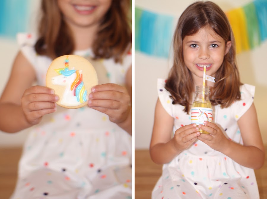 En la mesa coloqué platitos de varios colores neón , vasitos arcoiris, pajitas de colores con mini banderines y las cajitas unicornio que tanto os han gustado. Son cajitas blancas que personalicé con cuernitos de unicornio y dibujé a mano los ojitos.