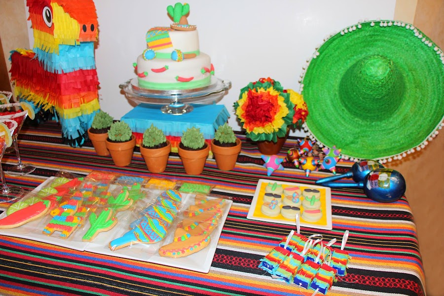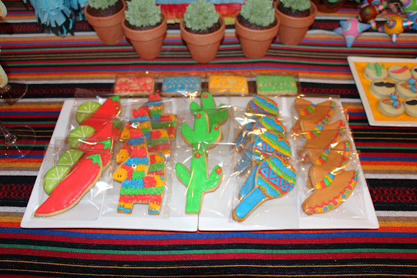 Y las galletas con formas que recuerdan a México, piñata, maracas, cactus, sombrero mexicano, chile, lima y galletas en forma de papel picado en las que ponía FIESTA y POL 12. Todas muy coloridas y muy alegres.