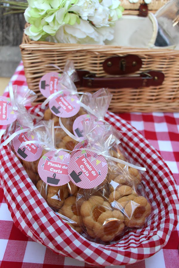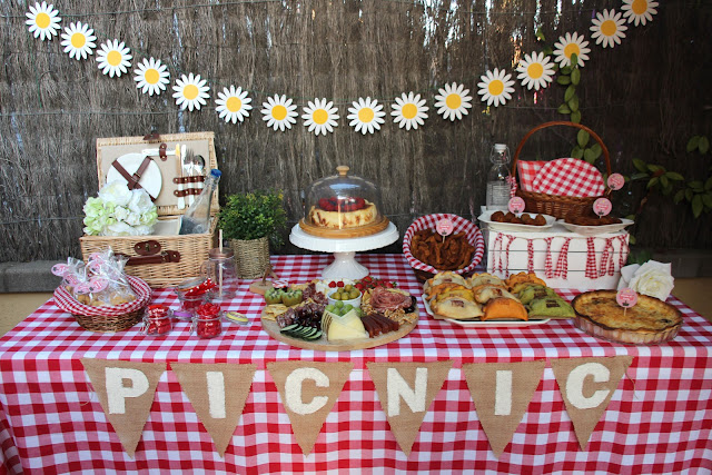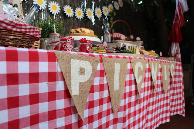 Los banderines con la palabra picnic pintada en blanco por nosotras dan un aire campestre y rústico a la composición