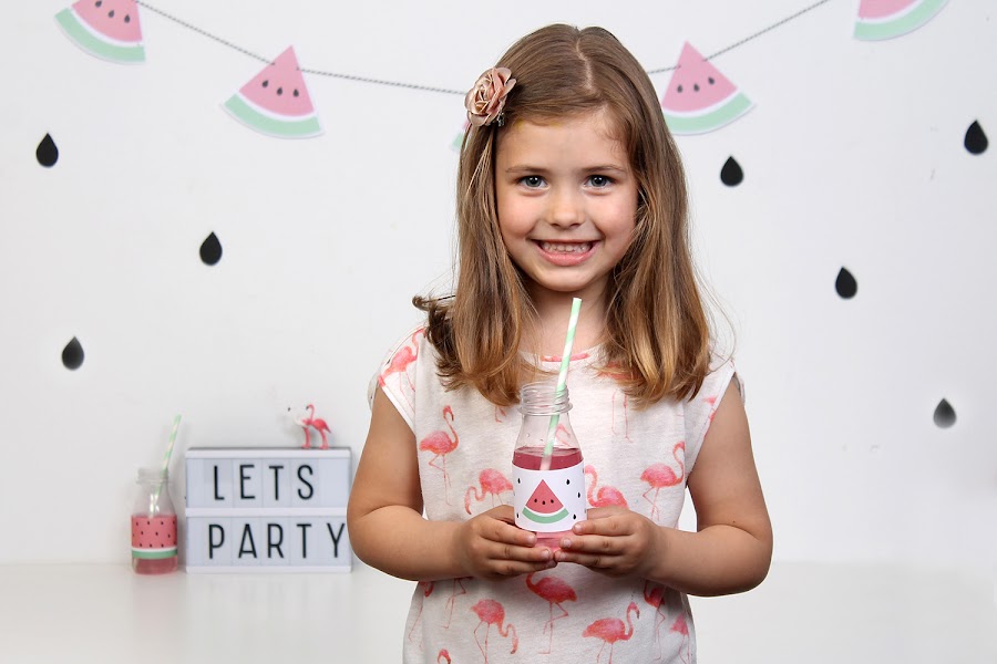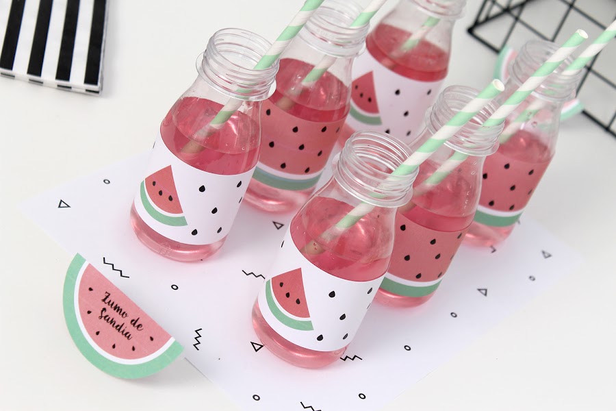 Para beber, zumo de sandía, en las botellitas decoradas con etiquetas.