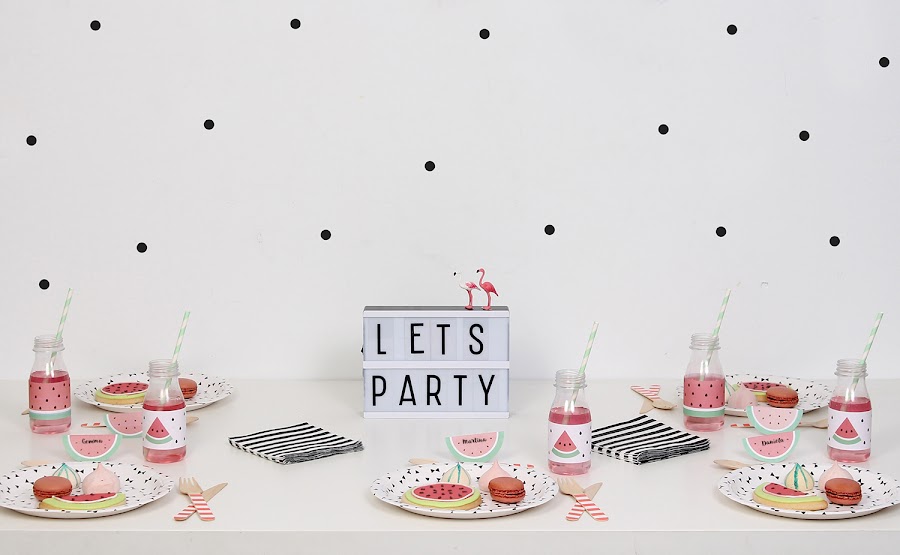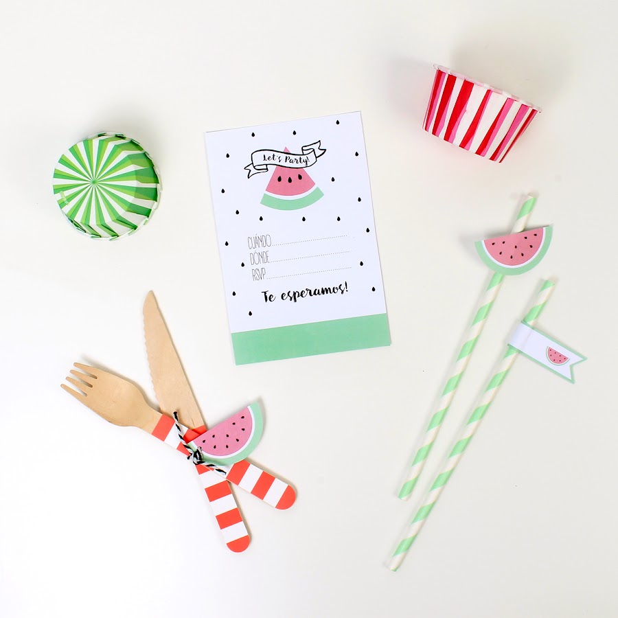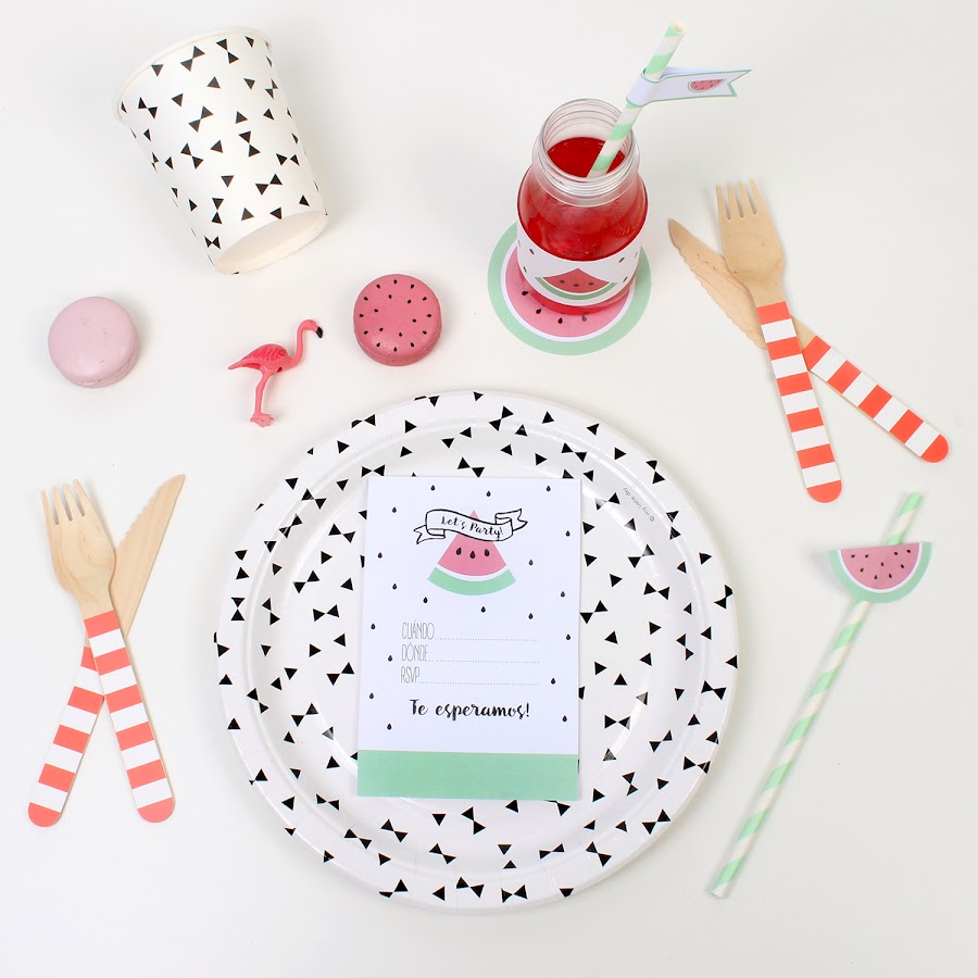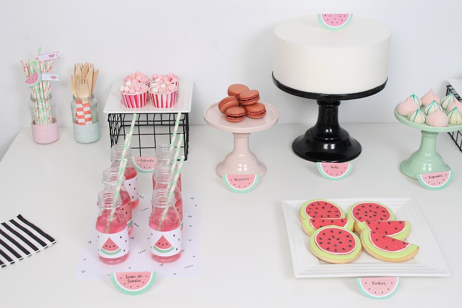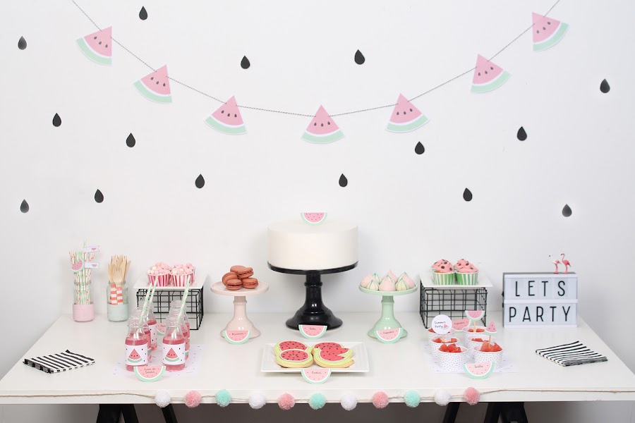 Para el backdrop recorté varias "pepitas" que pegué a la pared (os pueden servir los vinilos de gotas que están tan de moda) y la guirnalda de sandías (en el pack imprimible vienen dos modelos a elegir).