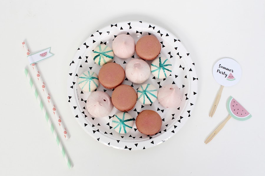 Los dulces consistían en: cupcakes sandía, marshmallows, macarons, merengues, galletas sandía, y por supuesto no podía faltar la sandía!, que serví cortada en daditos, ideal para pinchar con los palitos y toppers.