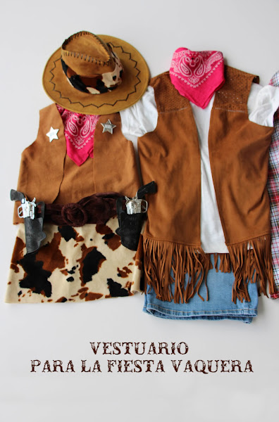 También nos hemos preparado la indumentaria vaquera, disfraz completo de cowgirl para Carla, todos con vaqueros, sombreros y bandanas, camisa a cuadros para ellos, para mí un chaleco de ante con flecos, botas, pistolas.... Totalmente equipados para nuestra fiesta vaquera.