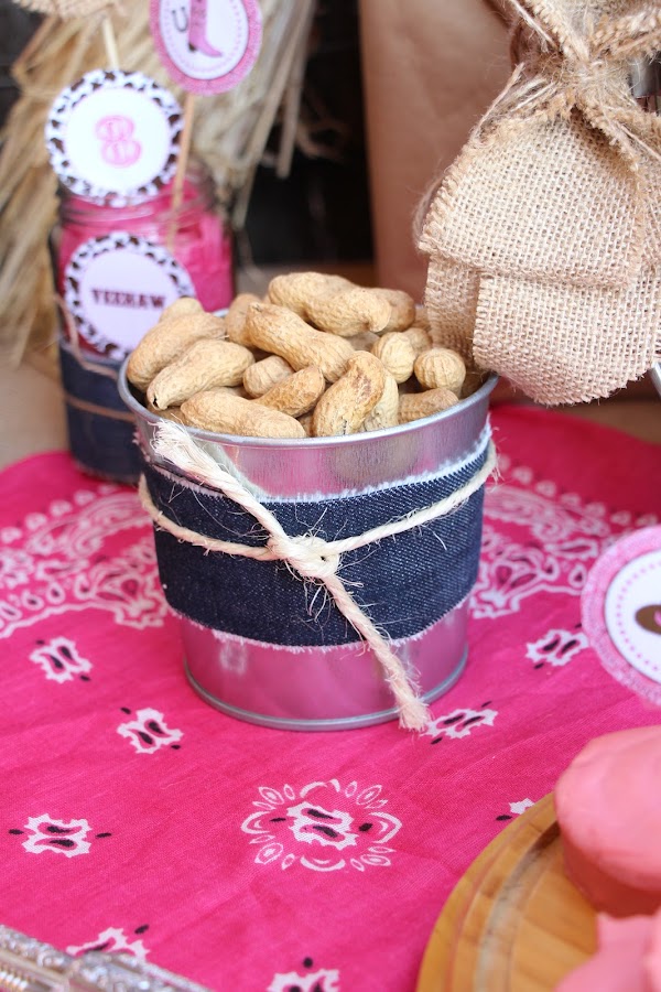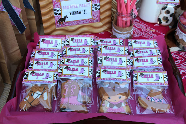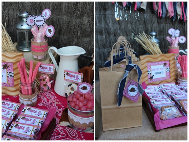 Para que se llevaran las chuches y galletas decoradas de recuerdo de la fiesta, preparé unas bolsas de papel kraft con una etiqueta con motivos del oeste y un poco de tela vaquera. Sólo con estos pequeños detalles las bolsas quedaron personalizadas con la temática western.