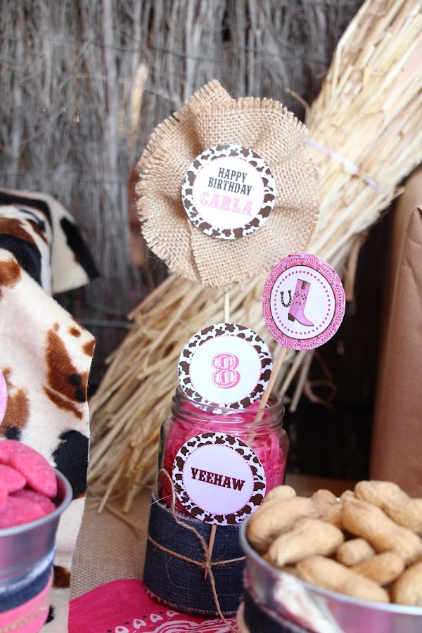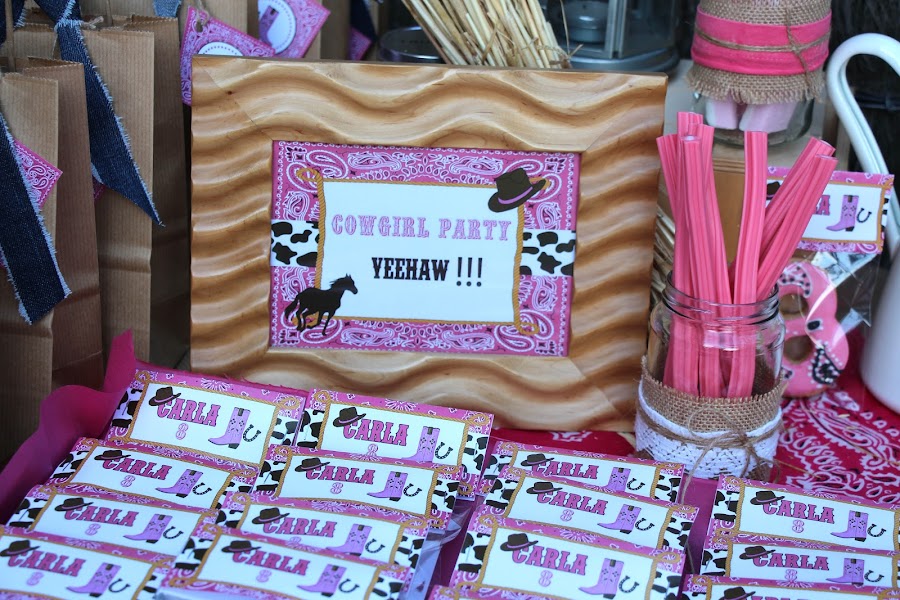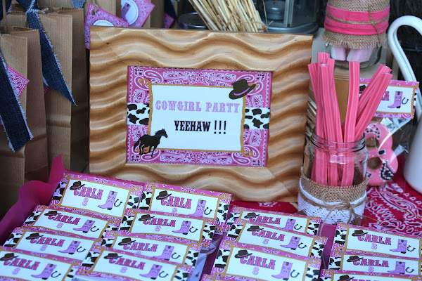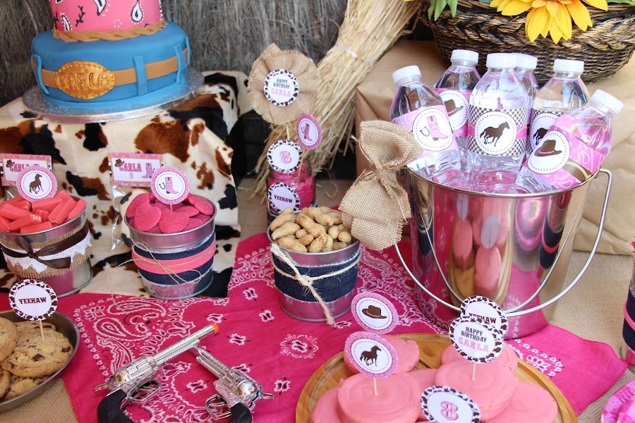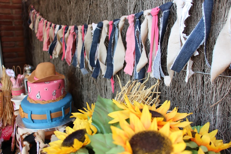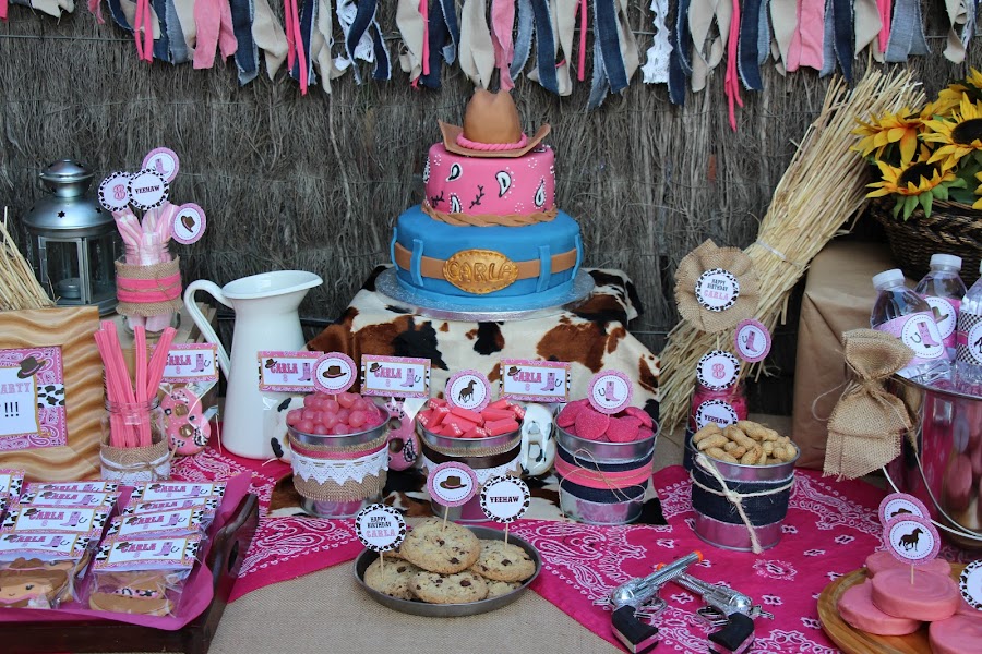 En el centro de la mesa, sobre una caja cubierta con piel de vaca, la tarta vaquera, la tarta del piso inferior simulaba unos vaqueros y en la hebilla del cinturón ponía el nombre de Carla, la tarta del piso superior era una bandana rosa, y como topper un sombrero vaquero.