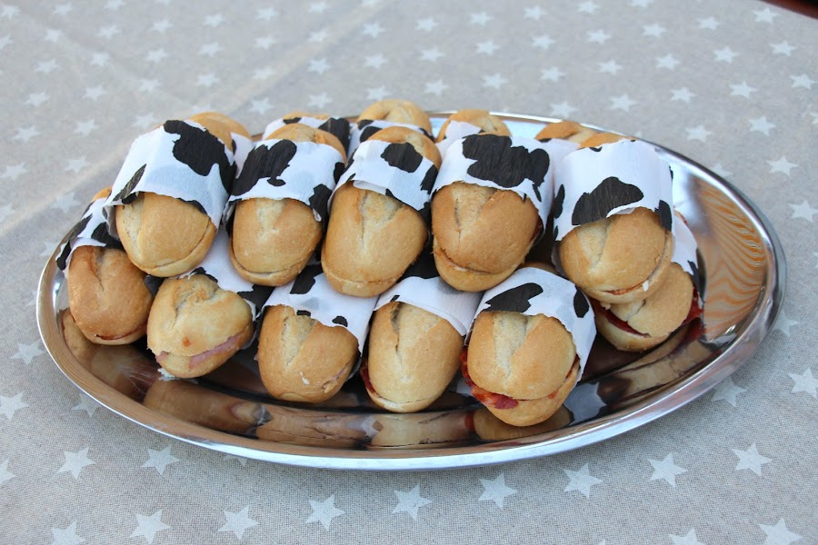 En cuanto a la parte salada, hice unos bocadillitos y los decoré con papel crepé de piel de vaca, quedando totalmente integrados en la decoración de la fiesta.
