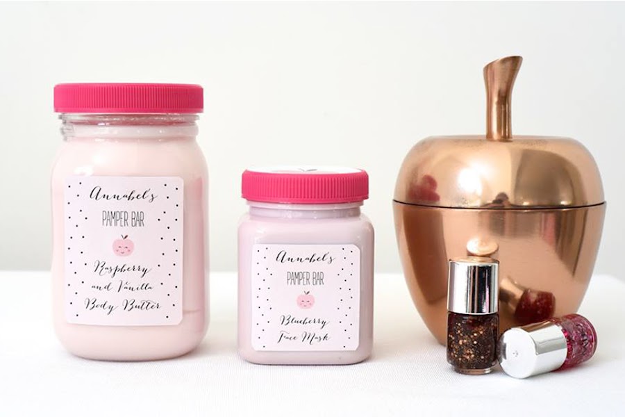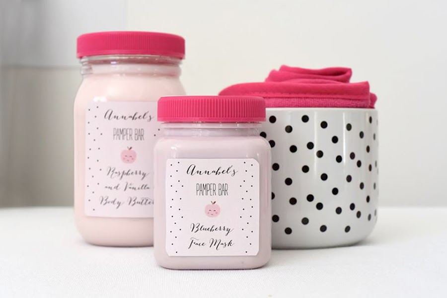 Pero además de la mesa dulce, Felicity decoró un rincón de belleza, para el cual también preparamos un cartel y las etiquetas de los productos.