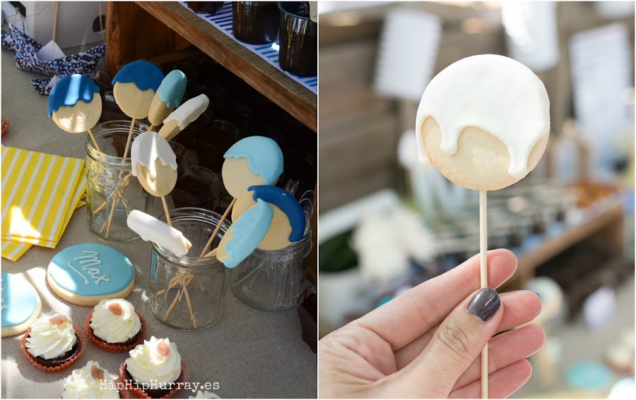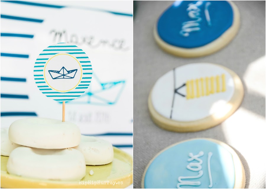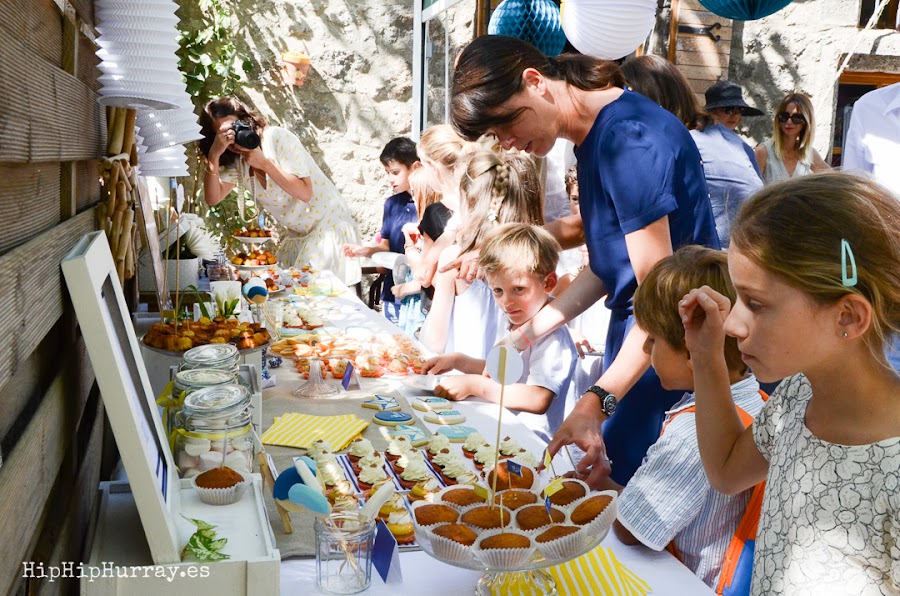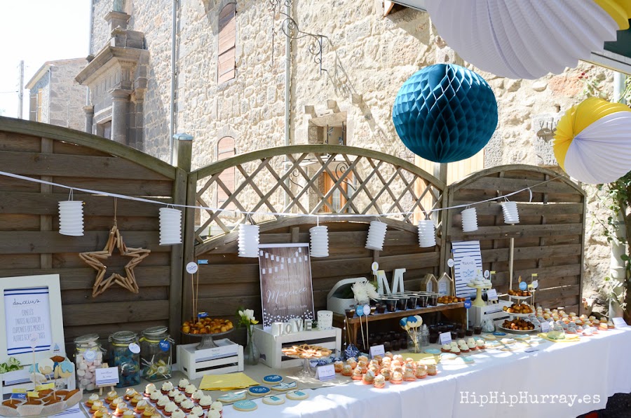 Y... después de este rollo que os he soltado, os quiero enseñar este bautizo marinero, con un aire moderno, combinando las rayas irregulares en azul con un amarillo y el toque natural de la madera.
