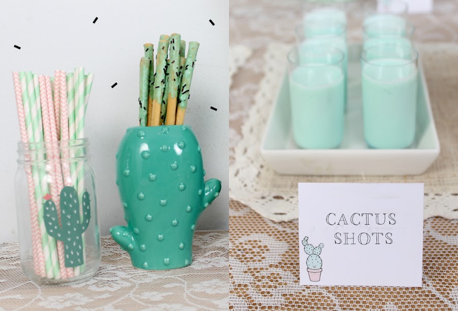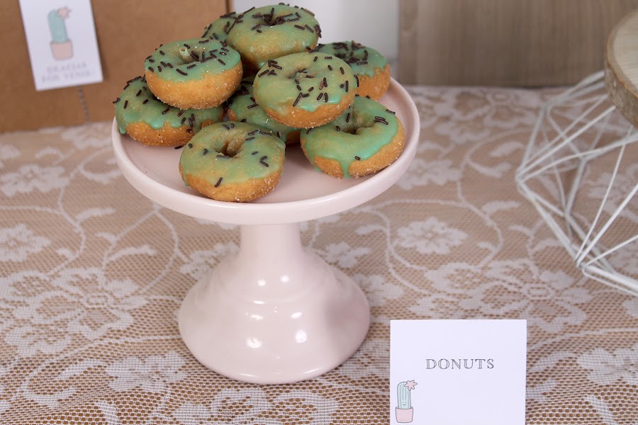 Para la tarta hice una mini drip cake en tonos verdes que decoré con toppers cactus, cupcakes de vainilla, macarons, mini batidos (cactus shots), palitos glaseados (cactus sticks) y mini donuts glaseados con fideos de choco, como si de pinchos se tratasen.