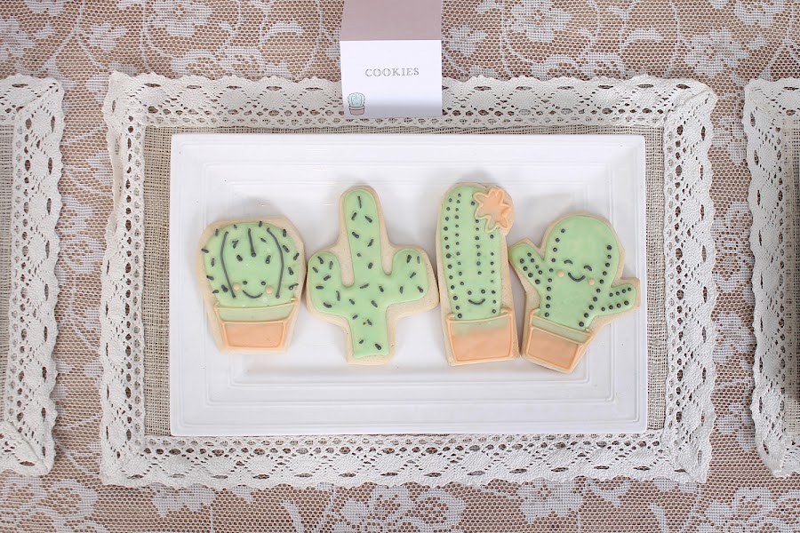 Para aportar más calidez a esta mesa, utilicé una mesa de madera natural que cubrí con un mantel calado. También como backdrop coloqué un tablón de madera con el texto Cactus Party.