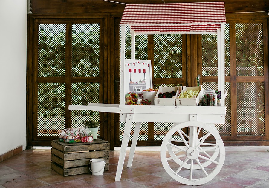 Inspirados en el estampado vichy rojo, hicimos un diseño moderno para la cartelería (Cartel de Bienvenida, Cartel para el carrito de chuches, place cards, etiquetas botellas, toppers, tickets).