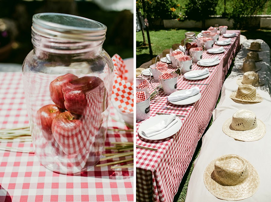 La mesa de niños me tiene totalmente enamorada, sombreros de paja esperaban a los invitados sobre balas de heno que servirían como asientos. Cada invitado tenía un cubo blanco con su nombre para recoger "frutas" del puesto, previo pago ;)