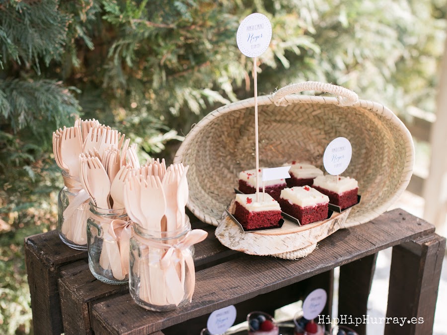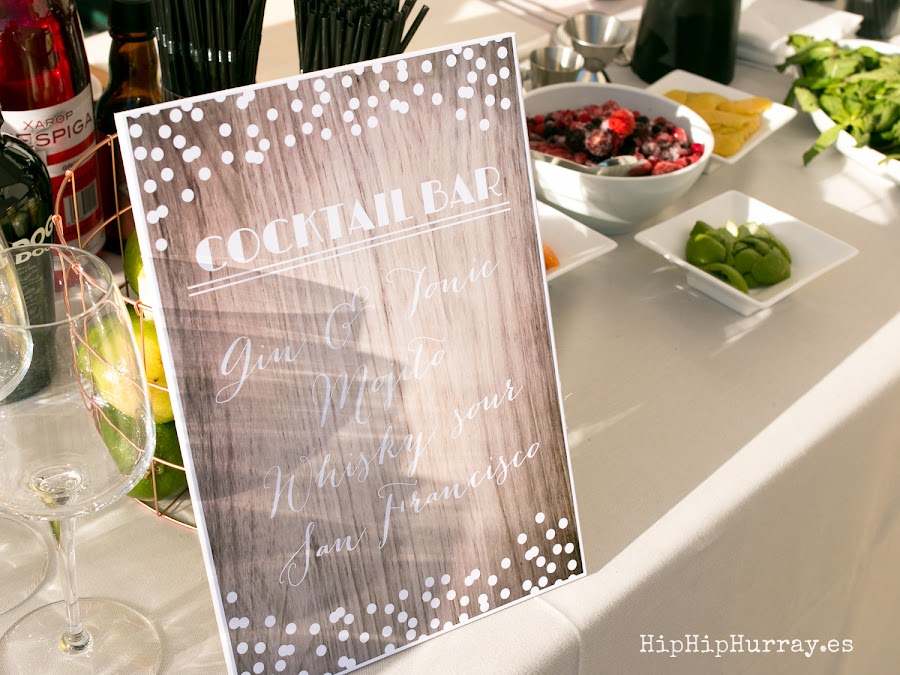 Diseñamos varios carteles para las diferentes zonas, un cartel con efecto madera para los Cocktails (todo un clásico ya en sus fiestas), place cards, toppers y un cartel XL para el photocall.